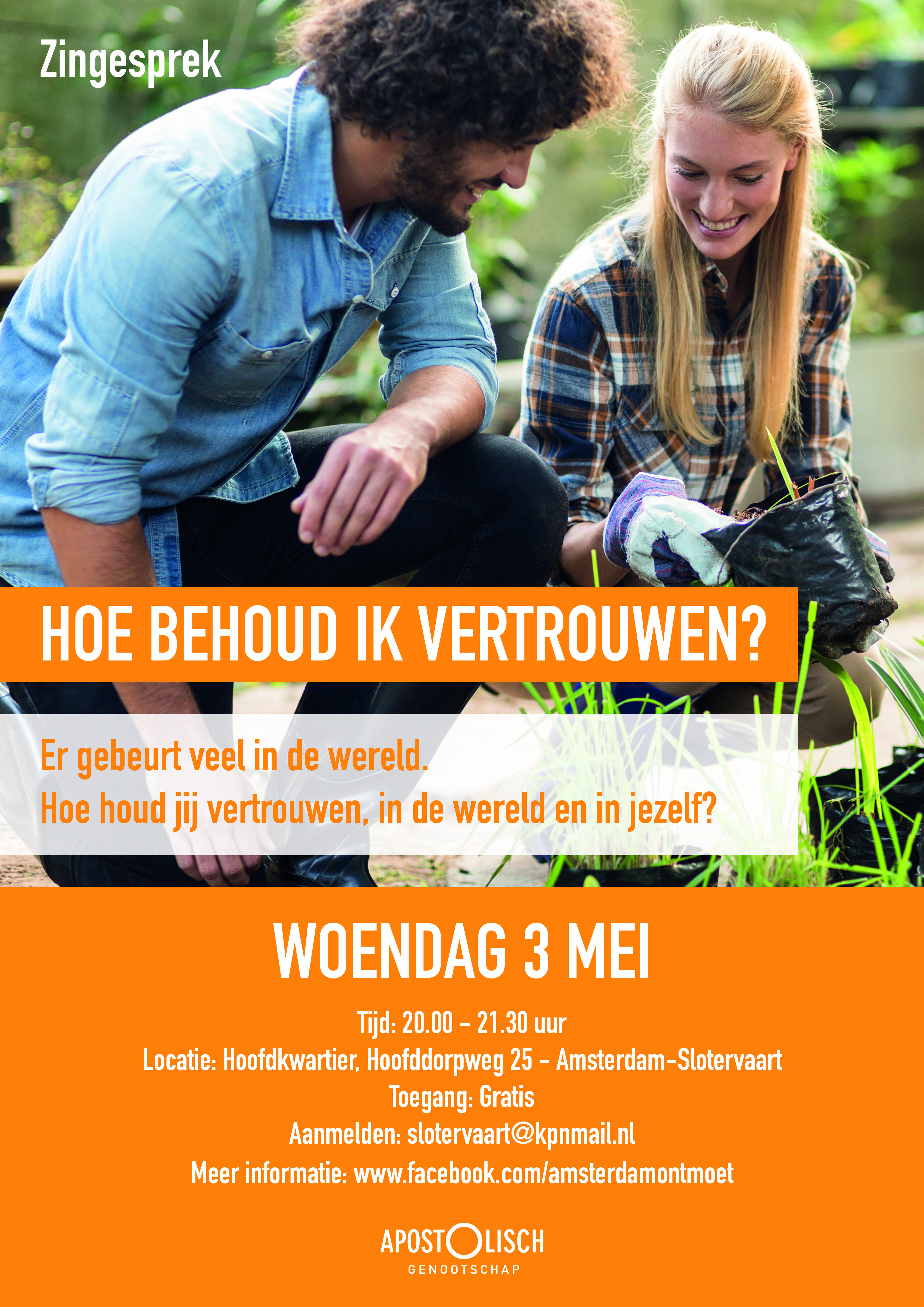 Er gebeurt veel in de wereld. Tegenstellingen lijken steeds groter te worden. Ook de klimaatverandering en toenemende spanningen tussen landen maken ons soms onzeker. Hoe kijk jij daarnaar? En hoe houd jij vertrouwen, in de wereld en in jezelf? Graag gaan we met elkaar in gesprek over deze vraag. Kom je ook? De toegang is gratis. Er is koffie en thee en na afloop een sapje.