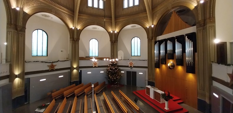 De musici brengen meerstemmige kerstliederen ten gehore, die in het monumentale gebouw met zijn bijzondere akoestiek fantastisch klinken.