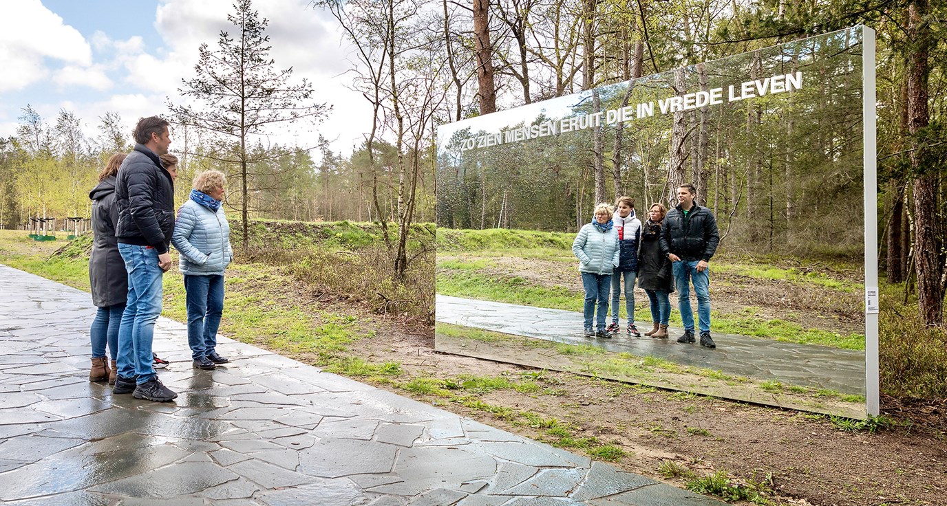 Op de Nationale Veteranenbegraafplaats in Loenen staat een gigantische spiegel waarop aan de bovenkant de indringende tekst staat: