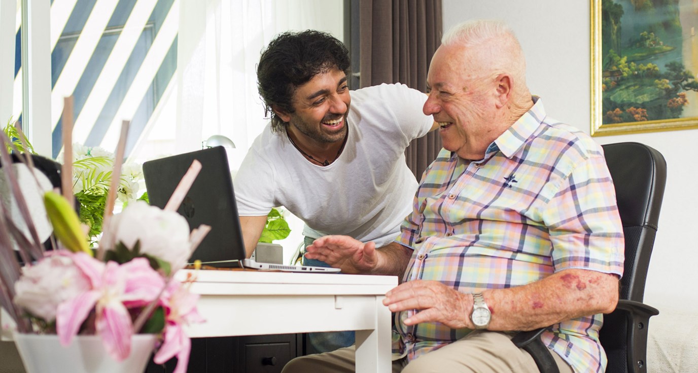 “Ik woon hier nu twee jaar, samen met vijf andere studenten. Voor de ouderen doet het veel om studenten om zich heen te hebben. Het gesprek gaat niet meer alleen over zere knieën en ander ongemak, maar bijvoorbeeld ook over onze verkeringen of over mijn Koerdische achtergrond, mijn studie Communicatie of mijn grote hobby breakdance.